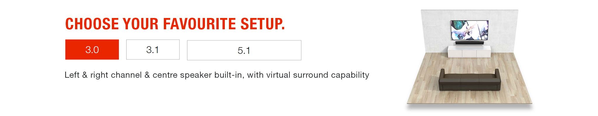 3.0 Setup: Left & right channel & center speaker built-in, with virtual surround capability