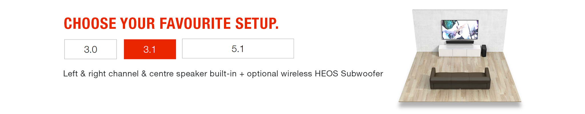 3.1 Setup: Left & right channel & center speaker built-in + optional wireless HEOS Subwoofer